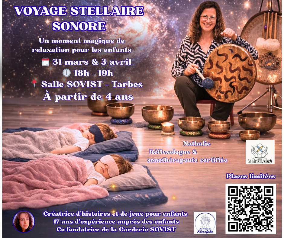 Une expĂ©rience magique de relaxation et dâĂ©vasion dĂšs 4 ans Offrez Ă votre enfant un vĂ©ritable moment de douceur, de dĂ©tente et dâĂ©vasion avec le Voyage Stellaire Sonore, une expĂ©rience unique mĂȘlant sons, imagination et relaxation profonde. Dans un univers apaisant, les enfants sont invitĂ©s Ă sâallonger confortablement et Ă se laisser porter par les …